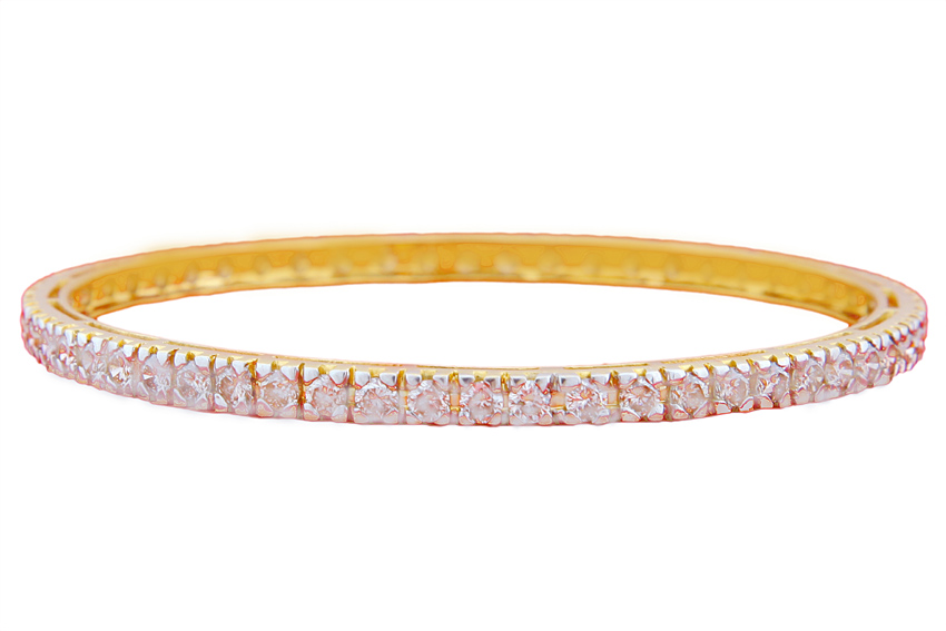 Description: This Bangle has been adorned with Natural diamonds This Bangle made in 18 kt Yellow Gold & Diamond carat 7.27 CTs,& Diamond Pcs 58 , Gold Wt- 20.59 Grams , Diamond color G-H With clarity I.