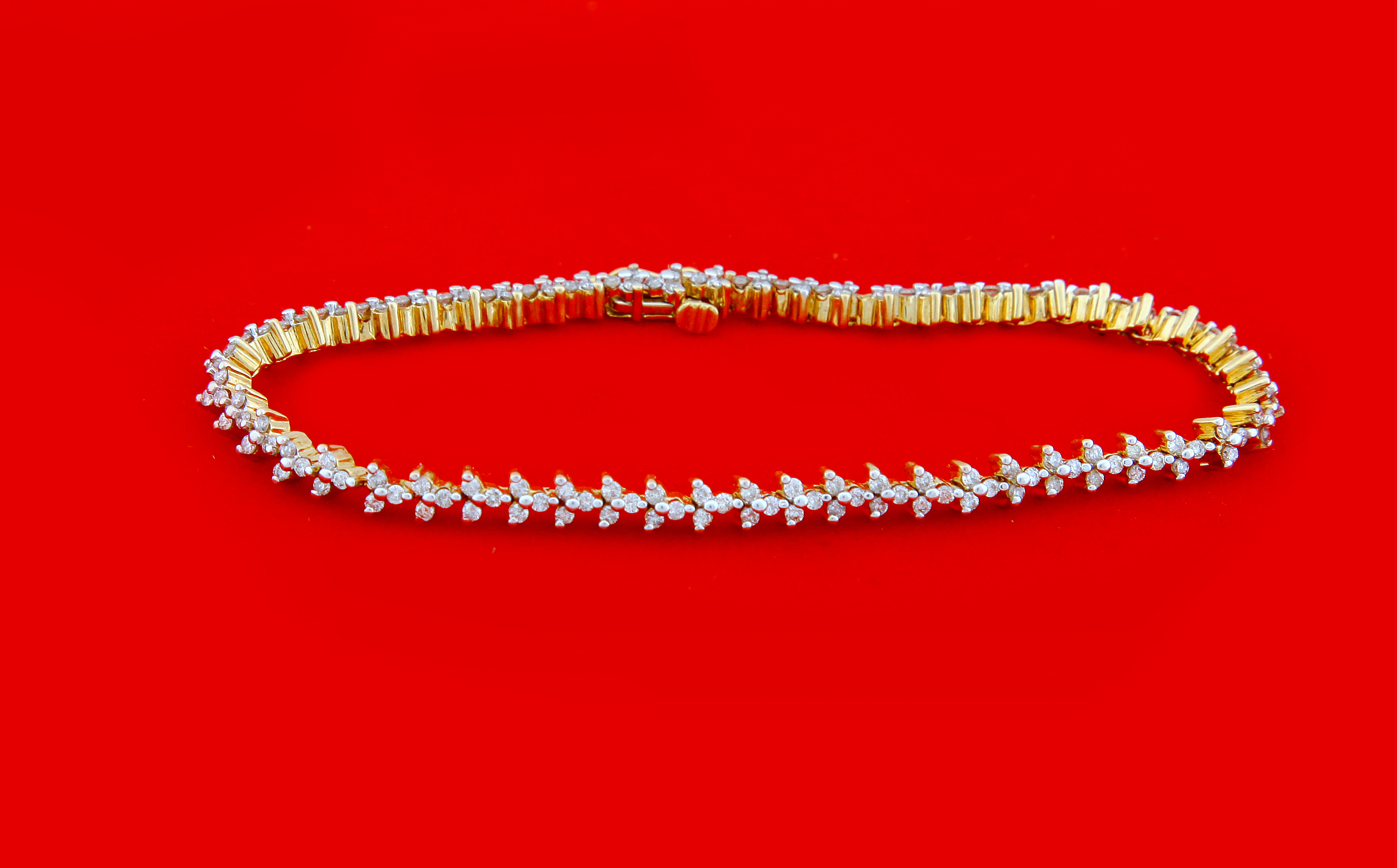 Description: This Bracelet has been adorned with Natural diamonds This Bracelet made in 18 kt Yellow Gold & Diamond carat 1.67 CTs,& Diamond Pcs 156 , Gold Wt- 9.85 Grams , Diamond color G-H With clarity I.