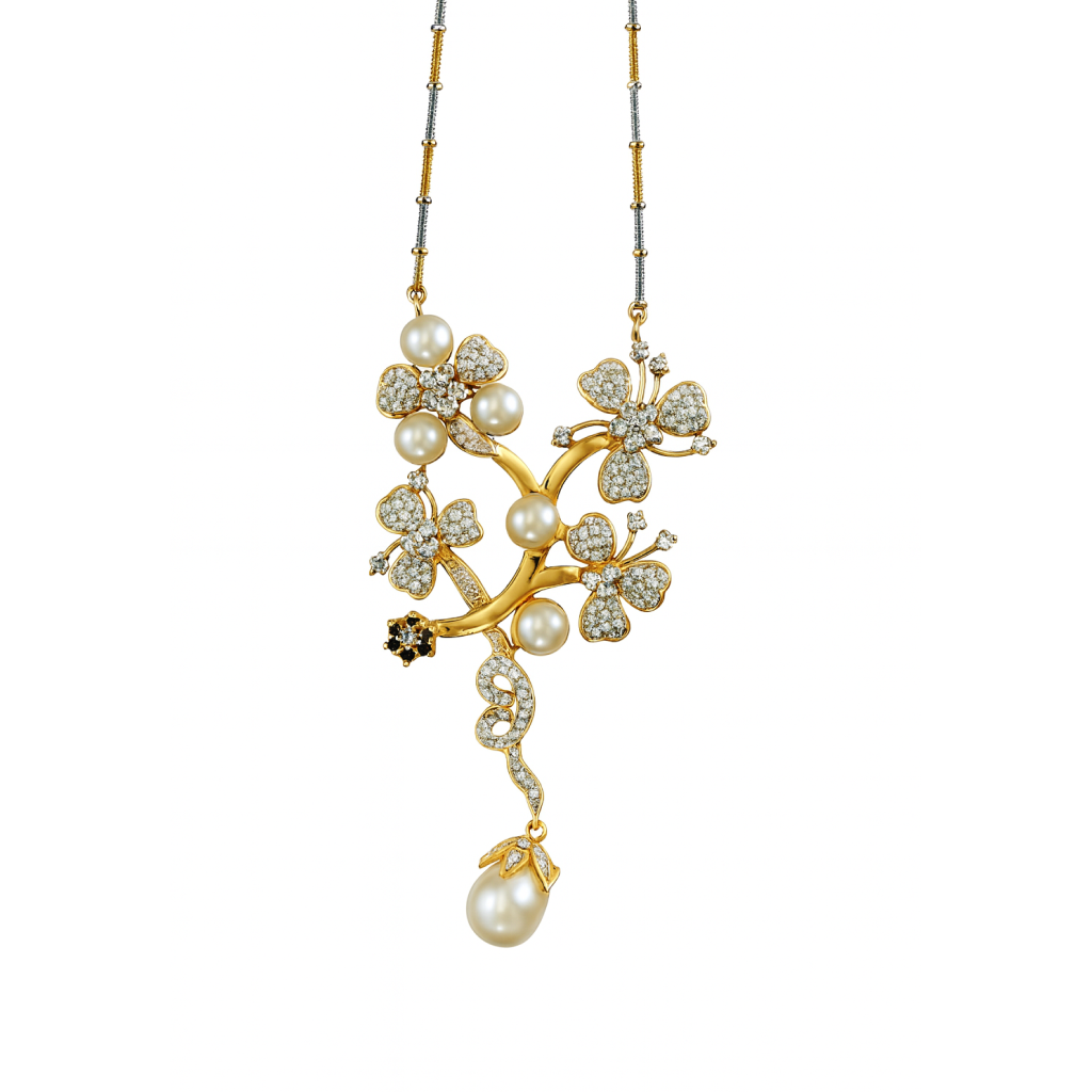18 KT Gold Blossom Diamond Pearl Necklace