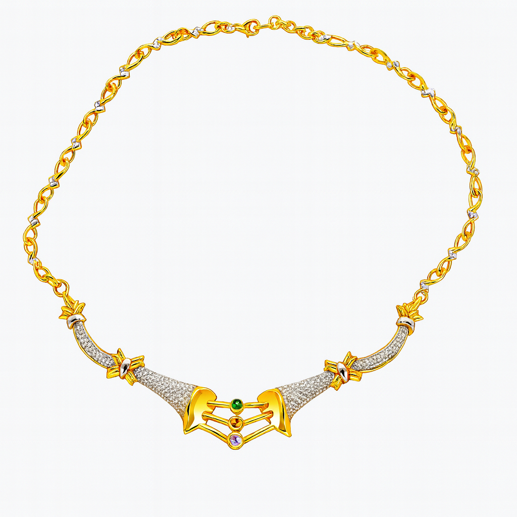 The Curved Diamond Gold Statement Necklace is characterized by its elegant curves, made from high-quality 18 KT gold and adorned with stunning diamond accents. Ideal for making a statement, it brings a touch of contemporary luxury and shine to your special occasion outfits.
