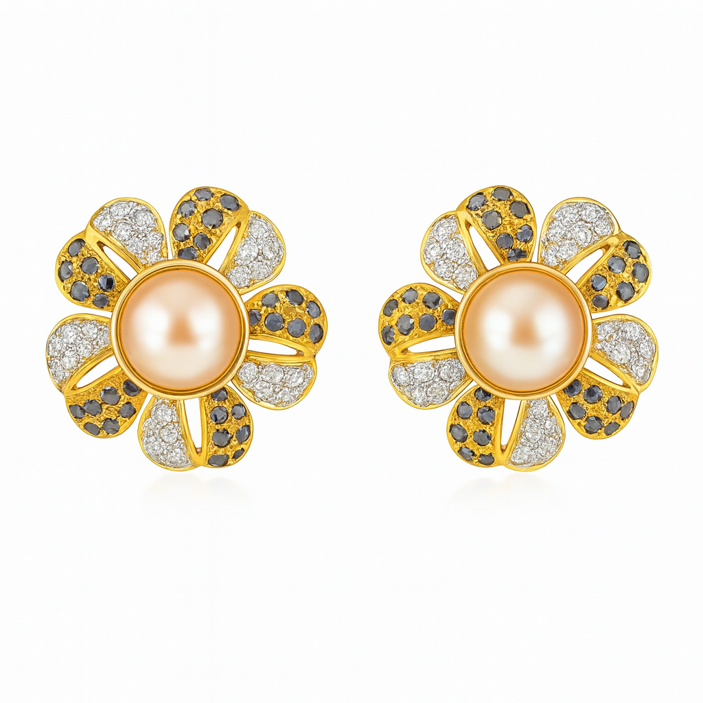 18 KT Gold Pearl with Black & White Diamond Stud Earrings